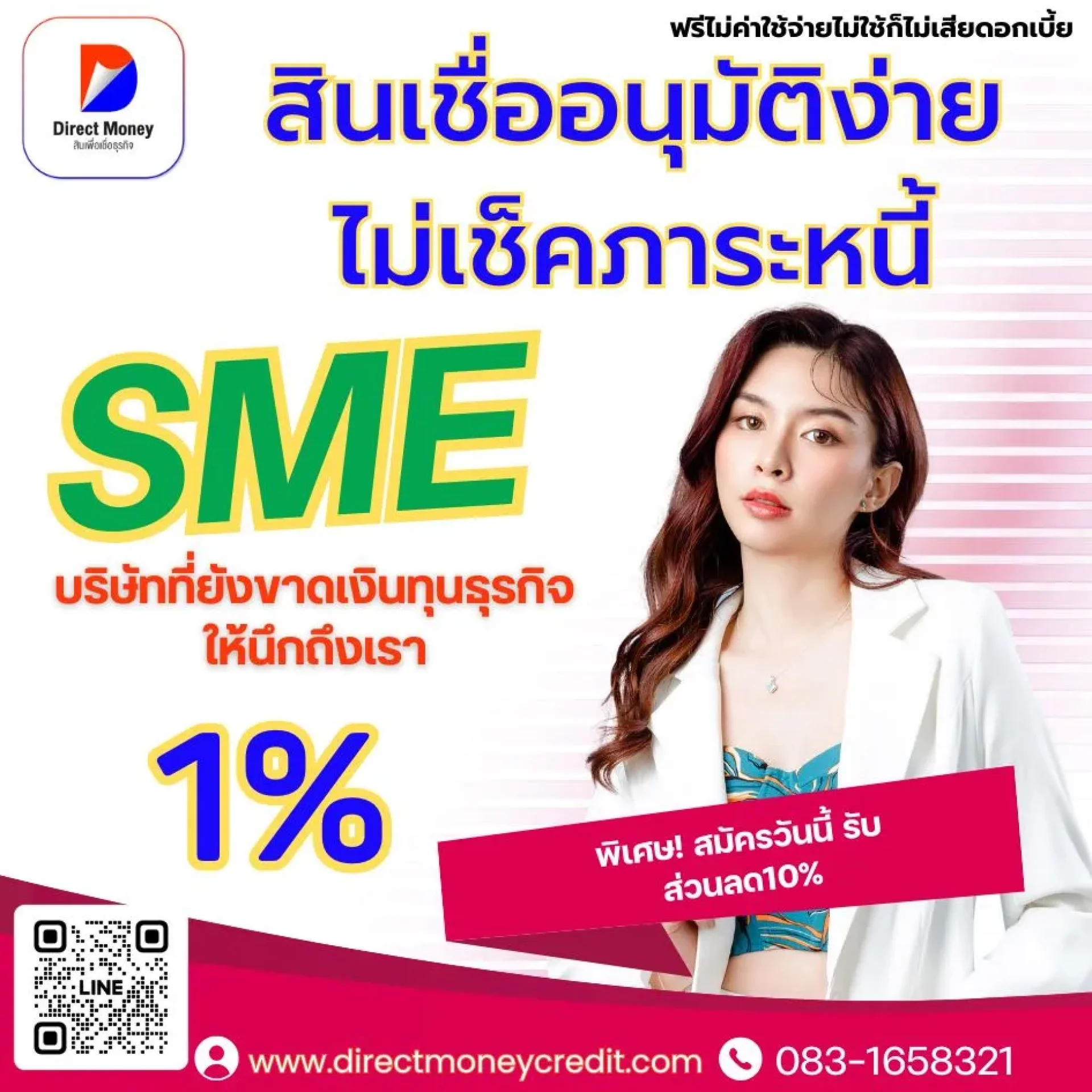 ภาพที่คุณส่งมาเป็นโฆษณาสินเชื่อจาก "Direct Money" โดยให้บริการสินเชื่อสำหรับธุรกิจ SME ที่ขาดเงินทุน พร้อมเงื่อนไขที่ระบุว่า "สินเชื่ออนุมัติง่าย ไม่เช็คภาระหนี้" และดอกเบี้ย 1% นอกจากนี้ยังมีโปรโมชั่น สมัครวันนี้รับส่วนลด 10%