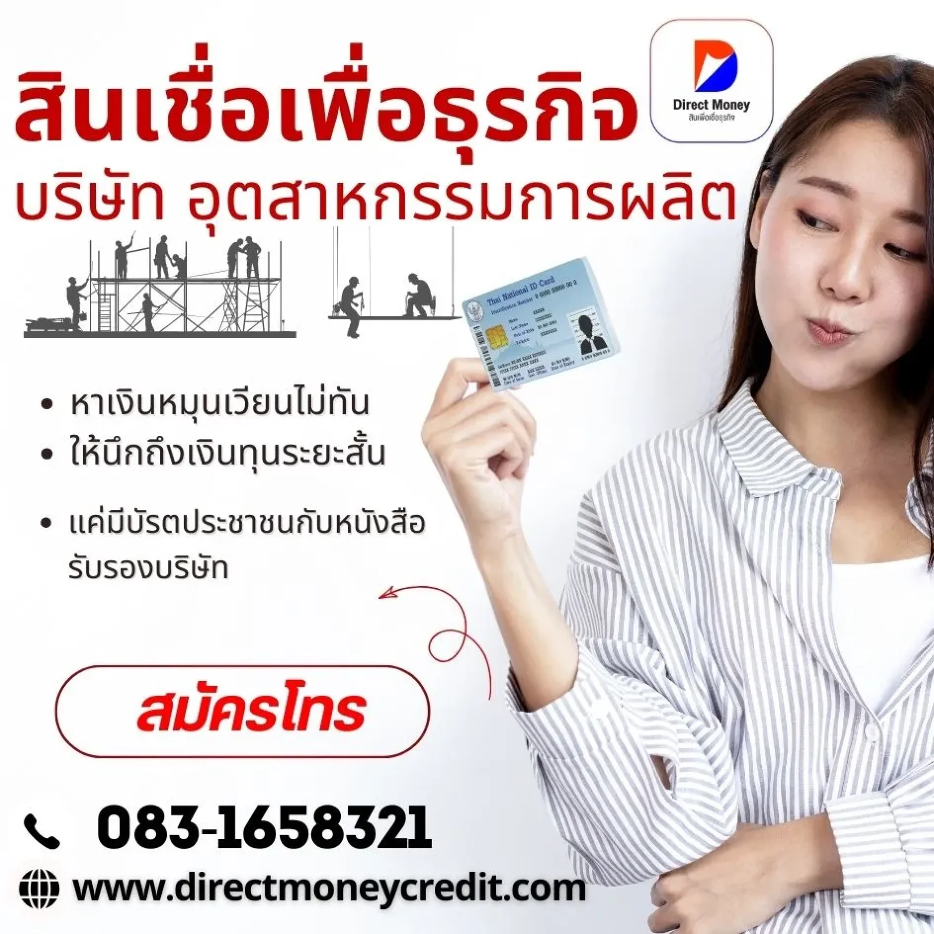 สมัครสินเชื่อเพื่อธุรกิจ วงเงินสูง เสริมสภาพคล่อง อนุมัติไว ไม่เช็คบูโร ใช้เพียงบัตรประชาชนและเอกสารรับรองบริษัท ติดต่อ Direct Money โทร 083-1658321