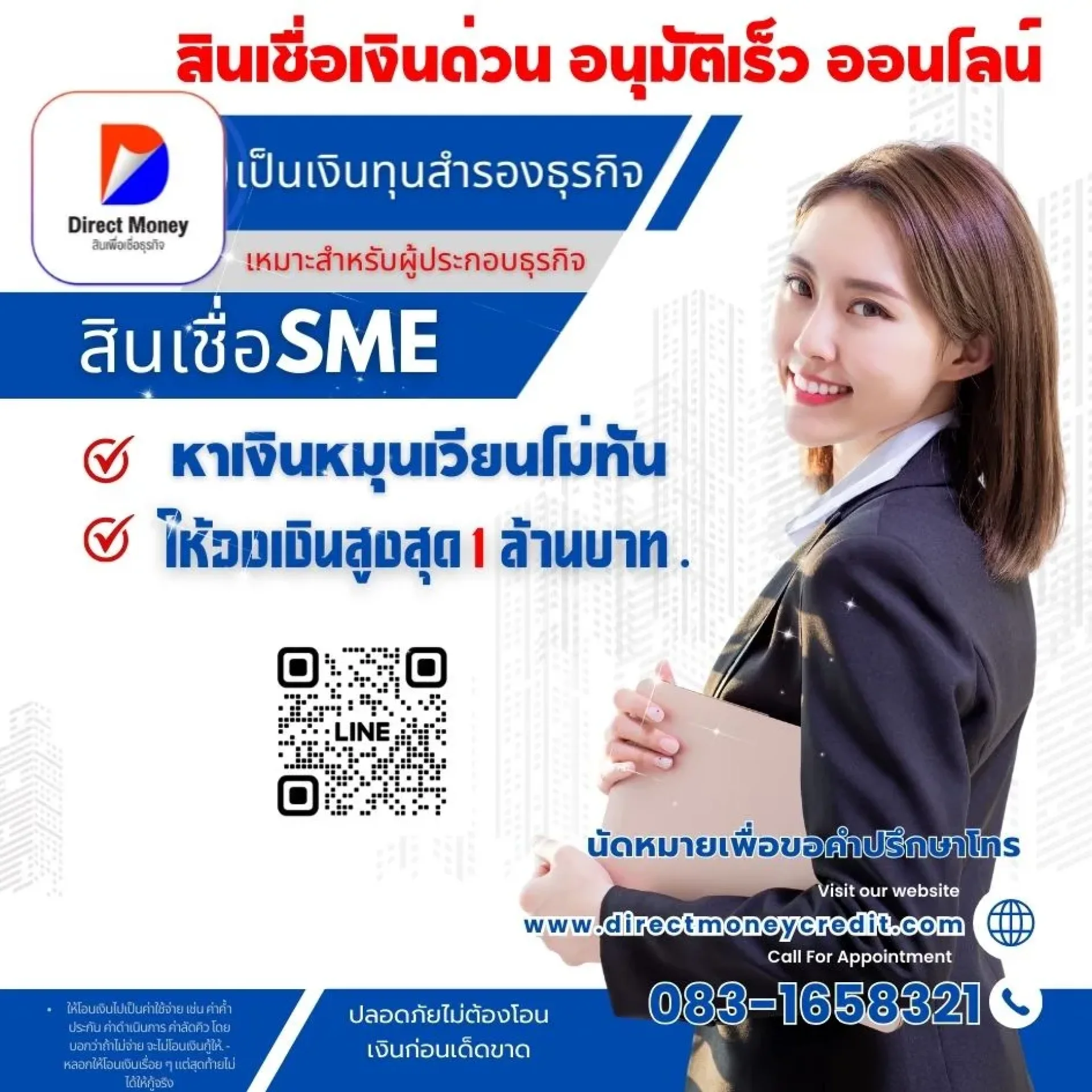 จากข้อมูลในภาพโปรโมท Direct Money ให้บริการ สินเชื่อเงินด่วน อนุมัติเร็ว ออนไลน์ ที่ตอบโจทย์ผู้ประกอบการ SME และเจ้าของกิจการ โดยมีจุดเด่นคือ
