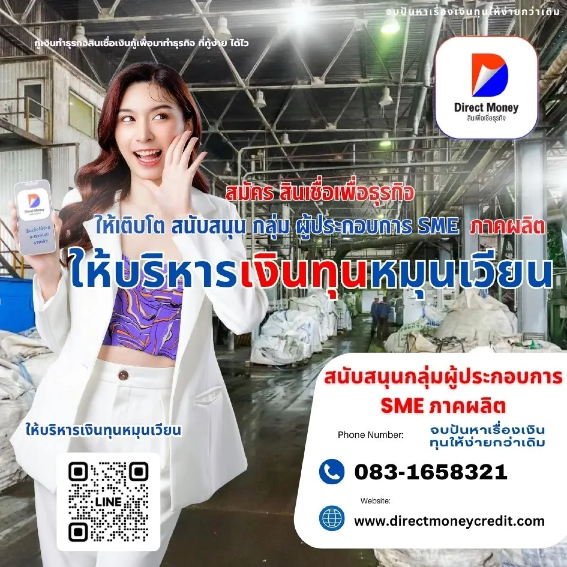 สมัครสินเชื่อเพื่อธุรกิจ อนุมัติไว ไม่เช็คบูโร สนับสนุนกลุ่มผู้ประกอบการ SME ภาคผลิต เสริมทุนหมุนเวียนให้ธุรกิจเติบโต ติดต่อ Direct Money โทร 083-1658321